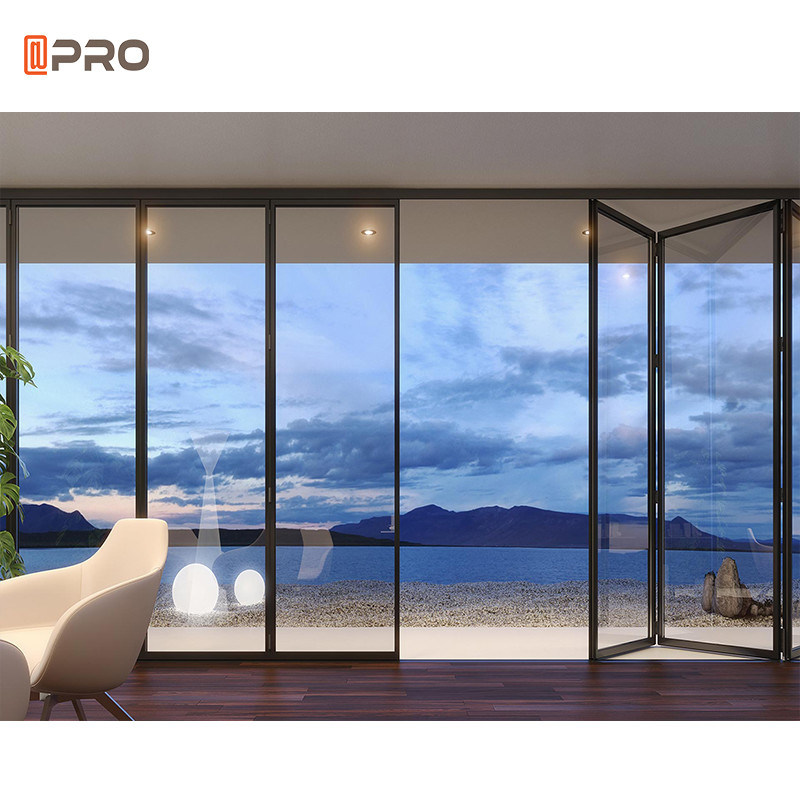 Puerta de vidrio plegable sin marco de aluminio de 2021 Sistema de puertas bi-plegables